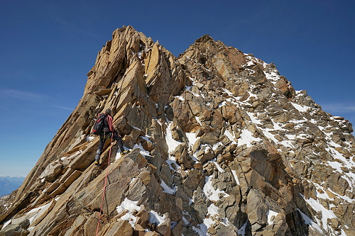 Pak se vracíme pro věci do bivaku a přes Parrotspitze dojdeme na Signalkuppe, kde stojí nejvýše položená chata v Alpách- Regina Magherita s krásným winterraumem. Následující den se má počasí odpoledne kazit, ráno tedy za svítání vyrážíme na poslední část hřebene. První je Zumsteinspitze, po něm nejvyšší vrchol Švýcarska Dufourspitze s pěkným plotnovým lezením pod vrcholem, z něj slaňujeme do sedla Silbersattel, odkud následuje výstup na osmnáctý vrchol v pořadí Nordend.