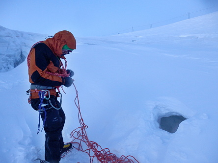 Hlavní problém nastává při sestupu, počasí přitvrzuje a viditelnost je stěží na 20 metrů - začíná bloudění, dostáváme se do trhlin a séraků které bychom neměli při sestupu normálkou z Breithornu potkat. Začíná být jasné, že jsme v háji a jediná rozumná varianta je nouzový bivak. Samozřejmě ráno, když vystrčíme hlavu ze záhrabu, zjistíme, že jsme cca 400m od horní stanice lanovky! No, co už naděláme? Vyrazíme zpět na bivak, kde nás čeká jídlo, pití a teplý spacák.