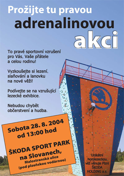 Blíží se totiž oficiální otevření Lezecké věže ve ŠKODA SPORT PARKU, Malostranská ul. na Slovanech v Plzni. (místo je známé spíše jako sk8park pod Homolkou) Toto slavnostní otevření se odehraje 28.8. od 13:00 a může se ho účastnit i nelezecká veřejnost, která si bude moci vylézt s pomocí intruktorů na vrchol věže a slanit. Také by tam měla být možnost lehkého občerstvení.
