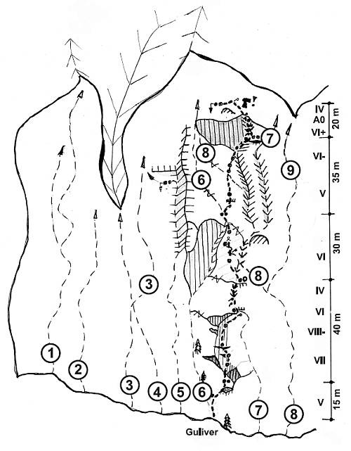 me se zda ze je v cestach na ostrve desny binec, na tatry.nfo.sk probihaly ruzne diskuze a myslim, ze v tom co kde je nema jasno nikdo. asi by to chtelo nakres cele steny se vsemi cestami, at uz delamyni zdola nebo zhora, aby v tom nebyl takovy zmatek.. treba cestu co ma byt na miste zmineneho gulivera jsem nikde nenasel.