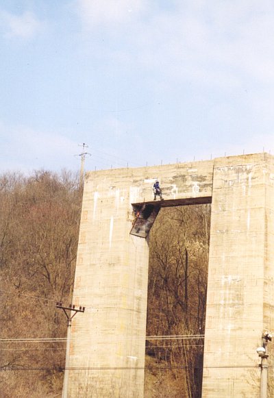 Sraz v 8 ráno před FASTem". Více neprozradil. Nepomohlo žadonění ani výhružky. Jura střežil svůj výmysl lépe než Jan Tleskač. Usnesli jsme se na místo setkání dorazit, ovšem s tou podmínkou, že pokud se bude jednat o nějakou blbost, dáme mu do držky za brzké vstávání a zameškanou  school. Ráno na sraz dorazil organizátor klasicky poslední. Aniž by definoval cíl mise, pouze se suše dotázal zdali jsme přibalili hamaky. Nasedáme na šulinu a valíme na prígl. Začínáme tušit. Ocitáme se na hrázi přehrady. Jestli měl v plánu vylézt hráz máme smůlu, zatopili nám cestu. Jura máchne rukou do levého svahu údolí Svratky: "Hle toť on" Přiznám se - tušili jsme to. Mostní pilíř plánované, ale nerealizované Hitlerovi dálnice. Akce s krycím názvem "Hajltůling" může začít. Prohlížíme možné výstupové trasy a hned je nám jasné na co cepíny. Na betonovém masivu je množství šroubů, na kterých byly dříve chyty (pilíř sloužíval jako stěna). Trasa vybraná a kdo jiný než plně vyzbrojený Jura se ujímá vedení. Jistí se co 2m v nýtech. Šlo by to i častěji obhozením šroubu drátkem vklíňáku, ale bylo by to zbytečně vyčerpávající. I tak je to záhul na ruce dost velkej a Jura hojně využívá nýty k odpočinku. Díky  značení výšky přesně víme v kolika se nachází metrech. V 17metru začíná převis (dřevěná deska přimontovaná do vinglu). Zajímavý krok, chňapnout desku na  efektivního sokolíka, přehoupnout se do "hnízda" ve vinglu a je vyhráno. Jura buduje důmyslný štand. Druhá délka bude na Vaškovi. Jura mu spouští naše dvě drajtůlingové zbraně (cepíny choďáky). Vybuší do hnízda a de na věc. Zkouší to direkt z vinglu přímo hore decentním koutkem, ale nejde to (i když ostřílenější praktik technického lezení by si nejspíš poradil). Vašek volí hezčí, ale také vzdušnější variantu výstupu a to traverz po hraně stropu překladu doprostřed a odtud nahoru (tato volba skýtá nejen více kovových chytů, ale také pěknou expozici s 20 metry ničeho pod sebou a 3 metry překladu nad sebou). Z hráze nás pozorují dalekohledem muž a žena zákona. A sakra. Naštěstí je policajt Pájův kámoš a policistka pohodářka, takže je vše OK. Přijíždí se podívat přímo pod pilíř. Policistka lituje že je ve služebním, jinak by prý určitě zalezla s náma. Chvíli s ní žertujeme. Vašek mezitím dobil vrchol. Pája Skynhýt a Alík odchází. Páju by neunesl namožený prst a Alík neunesl výčitky svědomí ze zameškané školy a odešel studovat. Kluci mi spustí prodloužené kovové ruce a hákuji po šroubcích nahoru. Je to výživné. Nahoře vrcholové foto a dolu slaňujem z erární smyce obhozené kolem čouhajícího prutu výztuže. Pro první 2 slaňující pojištěno smycí vlastní. Tož bolo to pekné a tudíž nemůžem dát Jurovi do držky. Nevadí snad někdy příště.