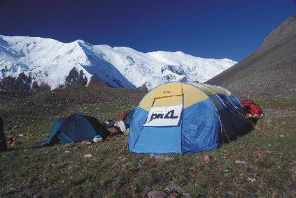 Vynášky nám zde narozdíl od nedalekého Leninova štítu nikdo neulehčí. Na každého z nás připadly dvě vynášky průměrně po pětadvacet kilo, některé ale mohly mít i ke čtyřiceti kilům. Takže každý kousek cesty překonal každý třikrát cestou nahoru a jednou cestou dolů. Během tří úseků pochodu do základního tábora jsme na svých bedrech natahali přes půl tuny materiálu na pěknou loučku s vodou a jezírkem ve výšce 4050m. Naštěstí  jsme nemuseli budovat tábor na ledovci Východní Kyzylsu. Ten zůstal za morénou vedle tábora.