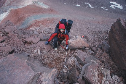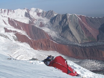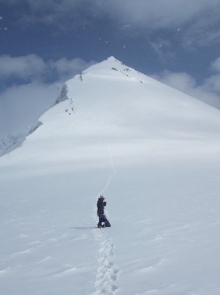 Další den jsme zpět a po přelezení rozrušeného hřebínku nastupujeme do sněhové ostruhy svahu, který končí na hřebínku u prvního tábora. Ten budujeme za pomoci lopaty a cepínů, je třeba vykopat tři plošiny v podmáčeném svahu. Na výšce 4900m probíhá první aklimatizace a další den za výborného počasí pokračujeme po hřebeni dále. Mírné stoupání přes svah plný trhlin vede k vyfoukanému hřebeni. Ten nás zase přivádí pod klíčové místo výstupu. Tím je strmý svah na skalní věž, který je pokrytý ledovým pancířem, uvolněnými kameny, prachovým sněhem a zmrzlou kolmou hlínou. Ďábelský terén jedné délky překonává Tom během úporných tří hodin. Odpoledne čeká zasloužený sestup zpět do základního tábora.