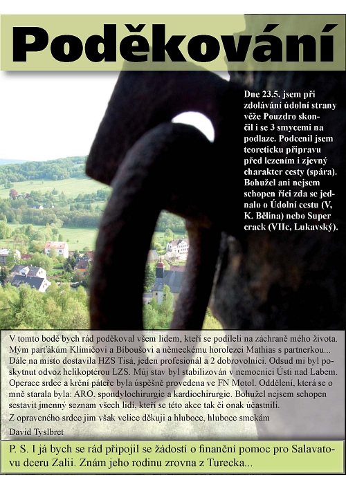 Osobně se neznáme. Držím ti palce, přeji brzké uzdravení a klaním se odvaze, se kterou se přiznáváš, že jsi udělal chybu. Dokonce nesvaluješ vinu na mizernou skálu, autora cesty a další okolnosti. Je to o to cennější, že poděkování záchranářům a doktorům se tady nevyskytují často a někdy se jim dokonce nadává...