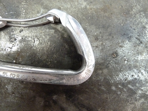 A ještě poznámka k duralovým karabinám: Výrobci karabin udávají pevnost karabin při zatížení napříč. Při zatížení podél je obvyklá pevnost mnohem vyšší, než ta napsaná na karabině. Pro pevnost napříč to nemusí platit, je-li karabina zatížená v místě háčku zámku. Karabina na obrázku má deklarovanou příčnou pevnost 800 kg, ale při zatížení 750 došlo k ulomení háčku zámku.