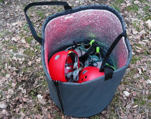 Musím přiznat, že jsem se zpočátku na tu trochu krátkou "alumatku", ze které lze pomocí dvou zipů, a kulatého dílu na dno, sepnout jakousi vyšší, kulatou tašku, díval tak trochu s nedůvěrou. Ta vcelku záhy přešla. Sepnutý koš jsem naplnil příslušnými krámy, odstěhoval do auta, z auta na stěnu či skálu a zpět, a nakonec jsem si rovnou navykl v ní lano, sedák, i lezečky nechávat. Při cestě na skály jsem jen přihodil přílby, cestou na překližku zase svačinu a lahev pití pro děti.