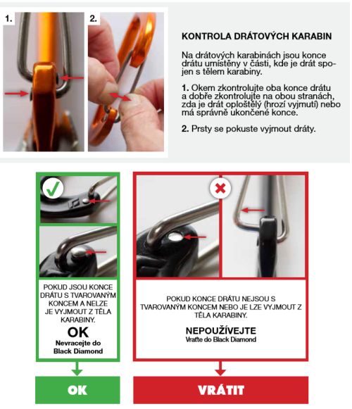 Pokud vlastníte karabiny nebo expresky, které spadají do rámce kontroly, pak Black Diamond žádá o provedení kontroly na základě postupu uvedeného v pdf dokumentech ke stažení. Pokud nevyhoví kontrole, pak kontaktujte Black Diamond, který produkt zdarma vymění.