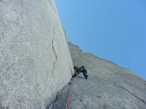 Medzitým konečne dorazil do mestečka zvyšok slovenskej a českej partičky. Ukázalo  sa ďalšie krátke jednodňové okno, ktoré sme chceli využiť. Tentokrát sme sa zbalili na 7 dní s cieľom prečkať zlé počasie hore, aby sme kratučké lezecké dni mohli využiť čo najefektívnejšie. Všetko opäť kvalitne vysnežilo, takže na lezenie ostali len nízko položené steny, ktoré sa dali vyliezť a zlaniť za jeden deň. Vybral som starú technickú cestu Bizcochuelo 6b, A1 z roku 1986 na El Mocho. Krásna logická 15 dĺžková línia, ktorá do dnešného dňa nemá voľný prelez. Všetko vychádzalo dokonale. Nástup, lezenie, technické dĺžky vyzerali, že budú v prvej časti voľne leziteťné do 7a. Do druhej časti steny bolo treba traverznúť 2 dĺžky po hrebeni a pokračovať ďalej 5 dĺžok v severnej stene. Tam sa však totálne zmenil vietor a my sme si uvedomili, že nedokážeme zlaniť k našim topánkam a veciam na nástupe. Zhoršujúce sa počasie a vyľadnené posledné 3 dĺžky nás definitívne utvrdili v tom, že to dnes nemáme šancu doliezť. Zvolili sme útek západnou stenou a po 10 zlaňákoch sme boli dole nad ľadovcom. Jediný problém bol, že v lezečkách. Nasledovalo zliezanie, traverzovanie, brodenie snehu, lezenie späť pod nástup východnej steny. Nakoniec sme všetko úspešne absolvovali a tesne pred zotmením zostúpili do Niponina.