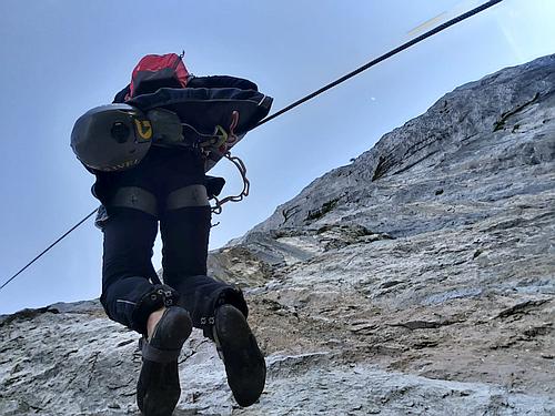 Další pasáž je na mně. Po vytrvalostním lezení po dírkách a později velkých kapsách dolézáme na starý štand do staré cesty. Zde ukončujeme naše snažení a na vrchol nedolézáme, neboť nám to přijde zbytečné a nemáme na to hlavně čas. Pomalu slaňujeme celou naší cestou a všechny volné kameny a kamínky posíláme do údolí. Některé pasáže lehoulince zevropšťujeme:)