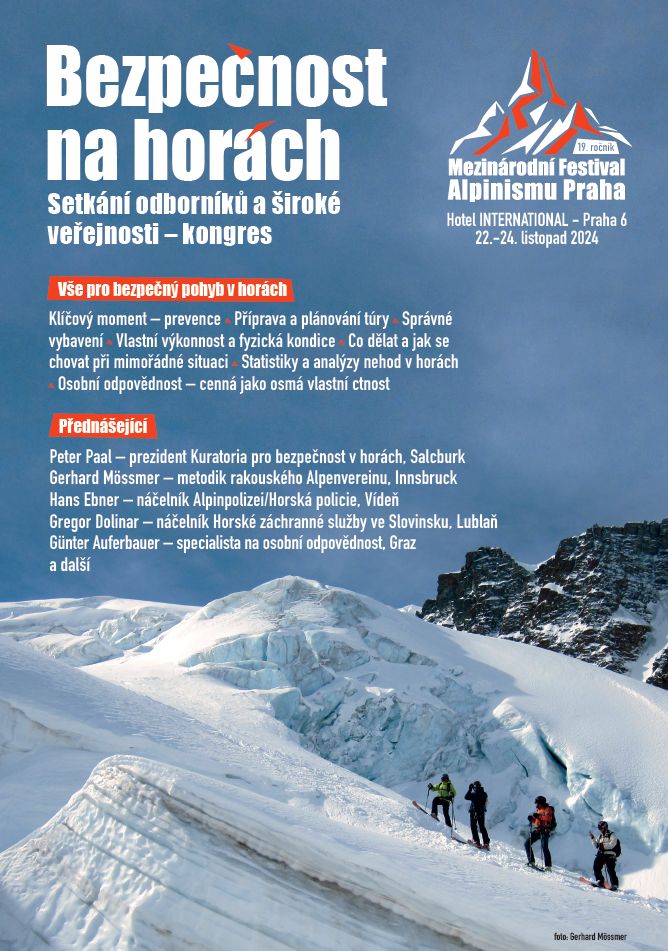 19. ročník mezinárodního setkání špičkových lezců a legend alpinismu se letos uskuteční 22. – 24. listopadu v hotelu International v Praze 6. Tematicky bude letošní Mezinárodní festival alpinismu Praha 2024 sestávat ze tří částí. V Praze se sejde opět několik světových vysokohorských lezců – jejich přednášky budou tvořit jednu část festivalového programu.
