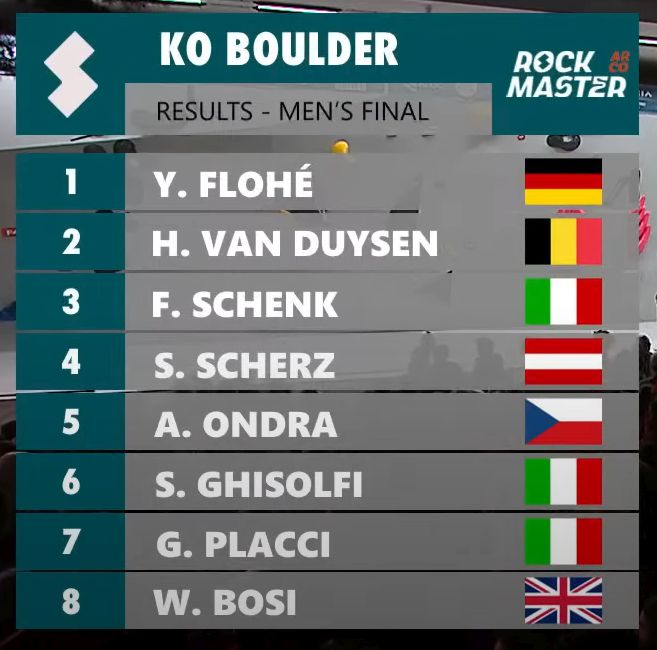 Disciplínu KO boulder na závodu Rock Master v italském Arcu vyhráli včera večer Němec Yannick Flohé a Slovinka Janja Garnbret, druzí byli Belgičan Hannes Van Duysen a Američanka Brooke Raboutou, třetí Ital Filip Schenk a Němka Anna Maria Apel. Adam Ondra se mezi trojici nejlepších mužů v KO bouldru neprobojoval a skončil 5.