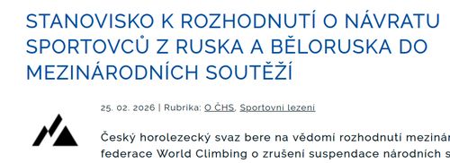 ČHS rovněž uvedl, že bude svůj nesouhlas s návratem ruských a běloruských sportovců nadále aktivně prosazovat na jednáních evropských a světových struktur a v rámci připravované diskuse na valných orgánech World Climbing.