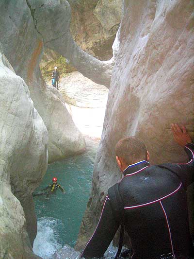 Co se jištění týká, tak ty komerční kanyony (to jsou ty do kterých tahaj za bakšiš klienty, u Arca to jsou všechny výše jmenované) jsou vystrojený dobře. U každýho slanění (i toho které se dá bez problémů skočit) minimálně nýty (obvykleji i řetěz mezi nimi) a mailonka na provlíkutí lana. Většinou je to i zdvojený aby jsi si vybral jestli slaňovat vodou nebo mimo vodu ;-))
