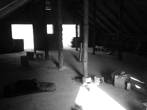 Možnosti: dá se spát ve stanu a nebo v „lagerraumu“ nedostavěné budovy (neber si jen alumatku, je to na betonu)