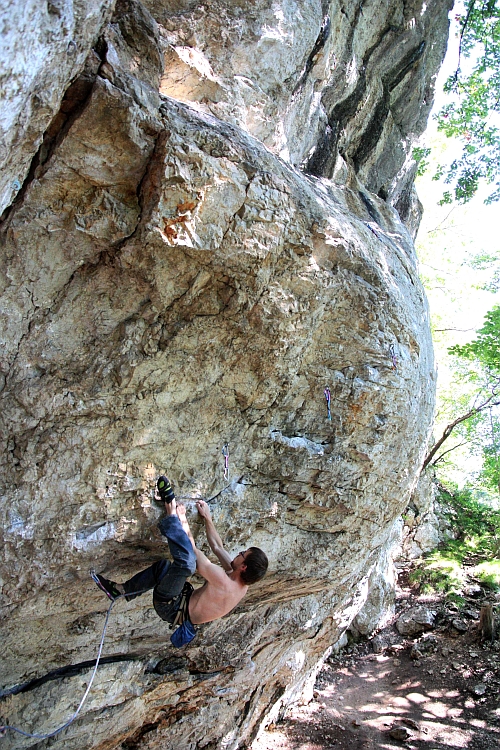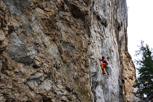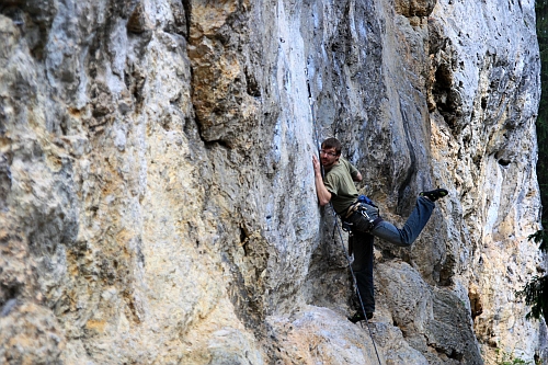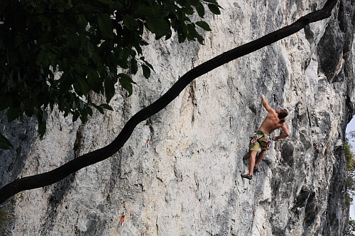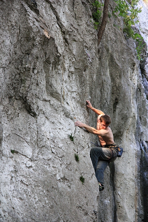 Danny balancuje na hranici těžiště v jednom z místních 7a (sektor Trapez, Kotečnik)