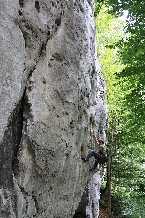 Den po dni předchozím vyrážíme do lichoběžníkovitého sektoru Trapez. A skutečně, krky tady dostanou zabrat, protože výše cest je kolem 30m a záklon je jednou z hlavních radostí jističů. Sektor je navíc jako jeden z mála nechráněn stromy a v případě svitu slunce sem svítí slunce. Cesty vysychají jedna přes druhou. Nejsme sami, kdo o tomto jevu ví a podskalí se v průběhu neděle plní svátečními lidmi. Tento sektor má dvě těžiště...jedno leží na úrovni stupně 6a a to druhé na úrovni 7a. Existují samozřejmě výjimky z pravidel, z těžišť. Vše je kolmé, vše je dlouhé, vše je technické. Večer Luka odjíždí, protože musí. Hrachových slz však netřeba, ještě se potkáme.