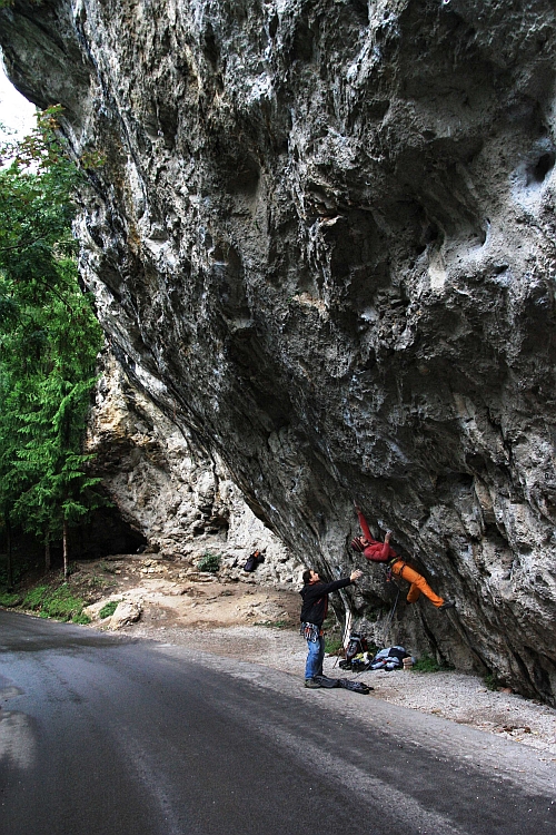 Ráno po kávě a jiných proteinech přijíždí Luka. Mocné stisky rukou střídají mocné nefrancouzské polibky úst a přes deštivé počasí se v nás začíná usazovat pozitivní, snad až optimistická nálada = Luka říká, že se dneska poleze. Že i přes celoletní chcanec, který ve Slovinsku letos zažili budou některé cesty suché. „Ach néé, to je ďáběl. Prý se dneska poleze. Prý bude něco suché“: špitá se kolem vařiče poštou tichou. A já teď již mohu říci, že Luka nelhal. V sektoru Nos byly skutečně jedna a půl cesty suché. Famóznost. Konkrétně cesty Džihád a ta spára vlevo od hlavního převisu. Dále se přesouváme do monstrózního sektoru Oboki (česky něco jako „Oblouky“). Do této jeskyňky se vejde určitě více než jenom dva prstíčky a Smolíček. Dá se říci, že je to výstavní kotečnikovský sektor s těžkými cestami. I něco lehčího se však najde. Luka povídal, že Adam O. tady kdysi onsightoval nějaké 8c a já mu to věřím a Adamovi jakbysmet (cesta Iluzija, 2012). Přestože vše je převislé více než hodně převislé, tak voda se dostává do skulin i skulinek a my nenacházíme suchého zhola nic. Čvachtáme se tedy v cestách, kde jsou chyty, které i vlhké se dají udržet, prsty okoupat, oláznit, náladu nahoře podržet. Vše se daří. A pak večer se přiblížil a my farmě.