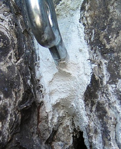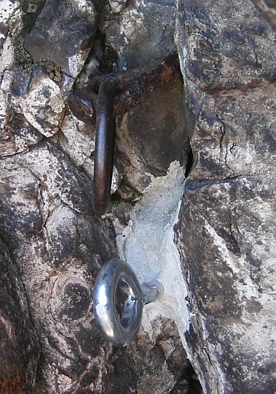 ...jsem si zase říkal, když jsem s úžasem hleděl na svérázné vylepšení vskutku již jen krajinomalebné skobky v Černolicích. Cesta Jižní rys za III. sice podle mne nepotřebuje, i vzhledem k velkým možnostem založení vlastního, nic do skály přidávat, ale pokud už, tak snad majngoteswill něco jinýho. Lezou tam i naprostý začátečníci a ti věří všemu možnýmu a zejména nemožnýmu. Jedná se o vertikální spáru. Je to cca 20m vysoko. Ta třetí je štand na vršku. Nejdřiv tam byl jeden vytahovací, teď jsou tam dva oplácaný...