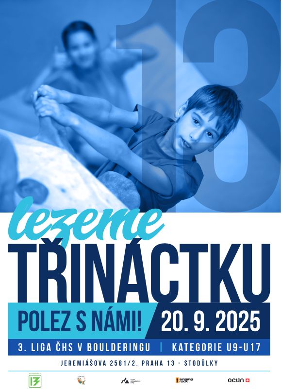 Lezení Praha, lezecká stěna Třináctka a ČHS za podpory Singing Rock a Ocún zve mladé lezce kategorií U9–U17 na 3. ligu ČHS v boulderingu! Závody se uskuteční 20. září 2025 od 9:00 hod. na adrese Jeremiášova 2581/2, Praha 13 – Stodůlky.