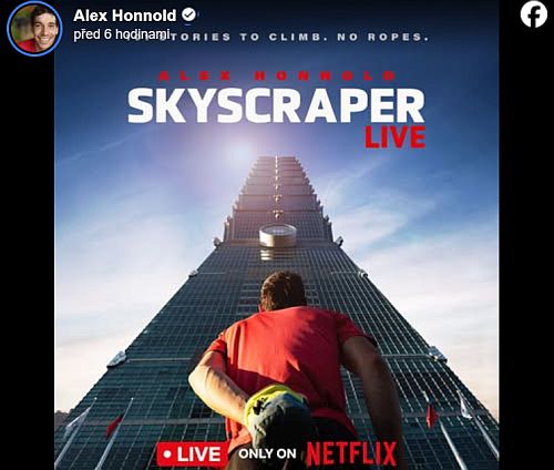 Americký lezec Alex Honnold dnes upřesnil termín svého dosud nejambicióznějšího urban-sola: Na taiwanský mrakodrap Taipei 101 poleze bez jištění v sobotu 24. ledna 2026 od 09:00 dopoledne taiwanského času (pátek 23. ledna 2026 amerického nebo středoevropského času). Celý výstup má v přímém přenosu vysílat streamovací platforma Netflix. ... celý článek